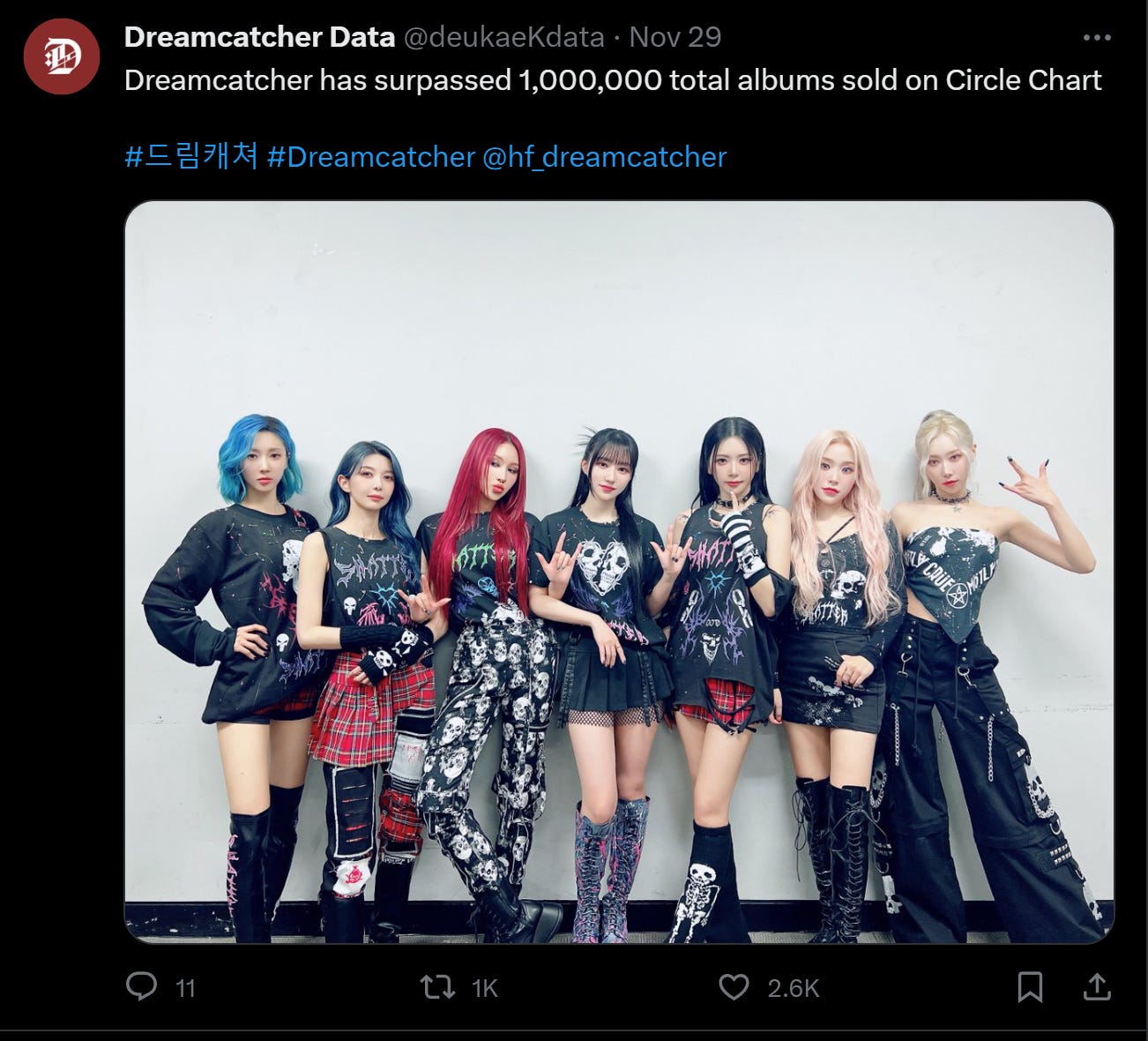Last, but certainly not least, Dreamcatcher passed a critical milestone this past week when tracking account DeukaeKData reported that Dreamcatcher has become the 14th girl group to surpass 1 million sales lifetime on the Circle (formerly Gaon) chart. According to DeukaeKData, this took 2,512 days. While the growth of the group’s sales may arguably be plateauing, for a group with the number of years Dreamcatcher has had on it with the non-traditional concept and company size they possess, this is nevertheless impressive. Dreamcatcher joins such heady company as TWICE, Red Velvet, aespa, MAMAMOO, NewJeans, IVE, and more, adding their name to a mix of domestically popular girl group stalwarts and new generation overachievers. Like with everything they’ve done, Dreamcatcher achieved this milestone in their own way and on their own terms. No matter where they go from here, they’ve achieved something great in an industry that is highly competitive and sometimes volatile, so they, the company, and the fans should be proud of that.