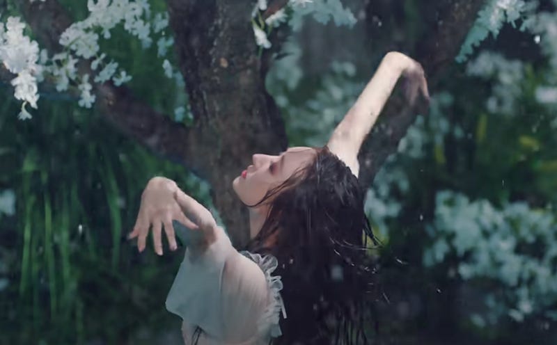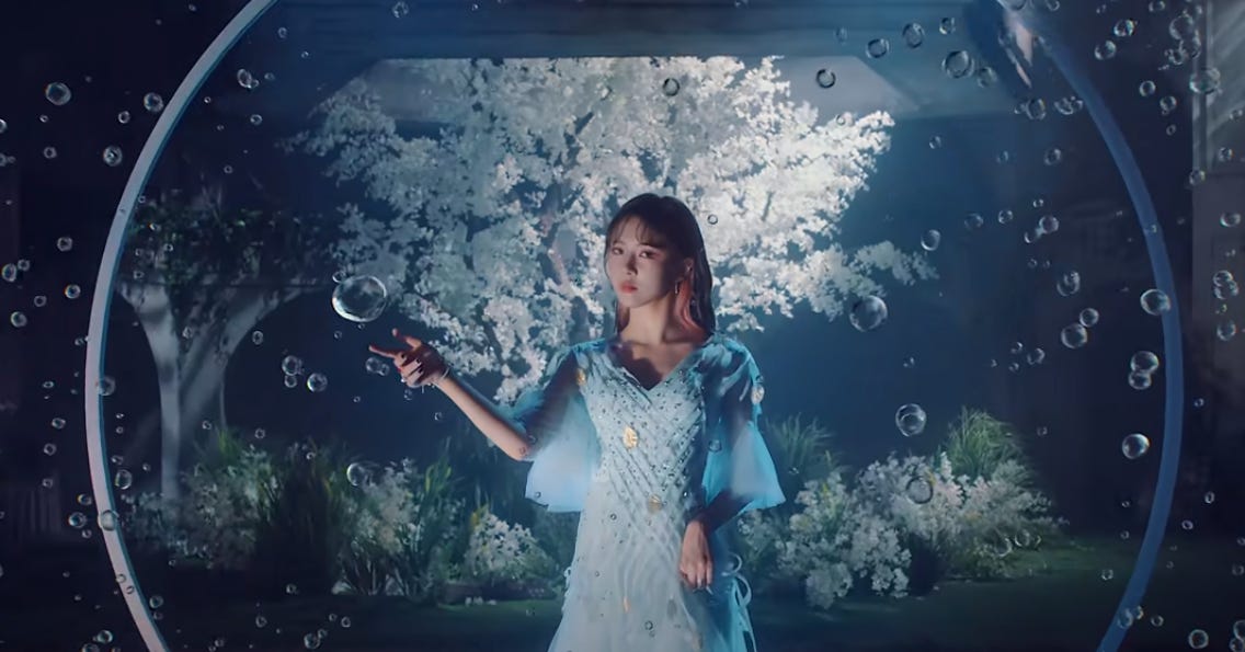 Multiple images depict Dreamcatcher in their role as water priestesses working with the water to try to purify the Tree of Language which, according to Siyeon in the “5 Minutes Before 6” radio interview at 42:15, “used to be so big in ‘Scream’ [but] got hurt so much that it gets smaller…it’s so upsetting”. We see the Tree, much reduced in size and with only a small number of white flowering fruit in the background, with Dreamcatcher in multiple shots working with water to try to help it along — SuA performing a flowing dance in the rain, Yoohyeon working with a body of water with air bubbles, and JiU sitting amongst its blossoms and running her hand through the water pool.