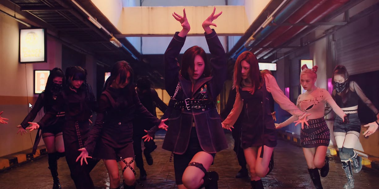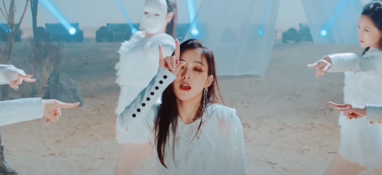 Combining this with the visualization, the “story” of the music video, and the choreography (with one such example pictured above), “Scream” bombards you with imagery and lyrics which depict a world in “Dystopia” where anyone can be targeted with hate comments as a “witch”. Additionally, on the other side of the coin, what’s also being said is that anyone can be a participant in that targeting, due to how easy it is to remain anonymous and produce hateful comments. The recurring image of someone behind a faceless mask is used in “Scream” to represent this sinister, harmful element that Dreamcatcher is trying to defend against, both in the video’s story and as they stated in a News1 interview, in their lives as idols: