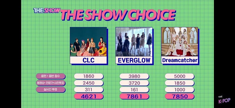 But in a moment that would become a flashpoint for some fans’ ire and angst over not having achieved a music show win in two years, Yuehua’s Everglow, a rookie group who just missed their first show trophy with a previous release, swept in on the back of a massive YouTube music video views advantage to edge out Dreamcatcher by a mere eleven points, achieving a first win for themselves (the fourth such group to achieve their first win at the cost of Dreamcatcher’s). Controversy would reign as some fans advocating for Dreamcatcher purported an apparent scoring disparity in the final totals, made worse by a fuzzy “Experts” score that wasn’t well defined. Though later determined that fans’ recalculated totals were based on mistaken scoring for Dreamcatcher’s music video views and that Everglow’s win was legitimate, the damage was done, and the combination of a near loss and the inability at the time to confirm accurate numbers caused no deal of upset emotion from Dreamcatcher fans.