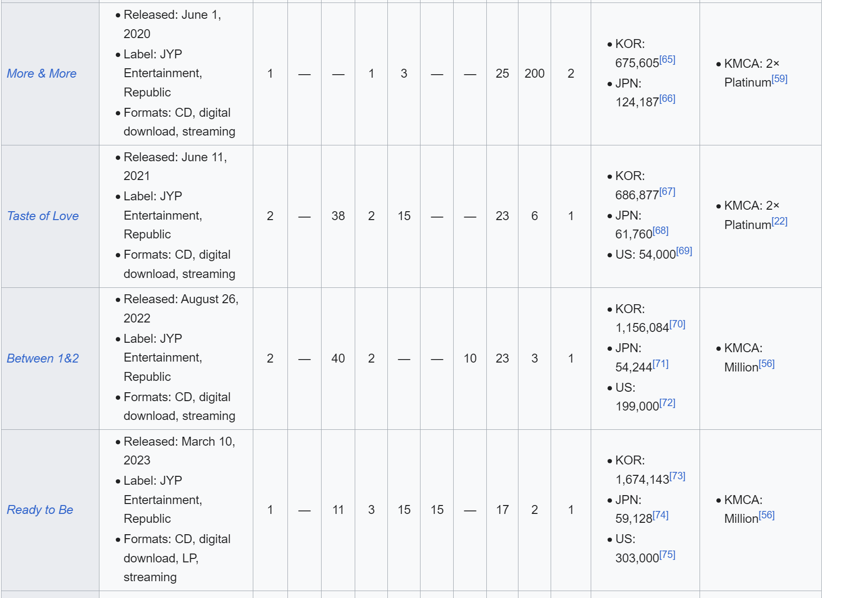 None of this takes into account the group's past achievements, which include 121 music show wins, a platinum certification from the Recording Association of Japan, multiple awards at MAMA, a bevy of endorsement deals for well-known brands such as Pocari Sweat, Estee Lauder, Nintendo, and more. Through it all, TWICE joins a bare handful of 3rd generation girl groups still actively releasing music every year (the others being Dreamcatcher, Red Velvet, Oh My Girl, and Blackpink), and show no signs of slowing down as they roll towards a decade of work in 2025.
