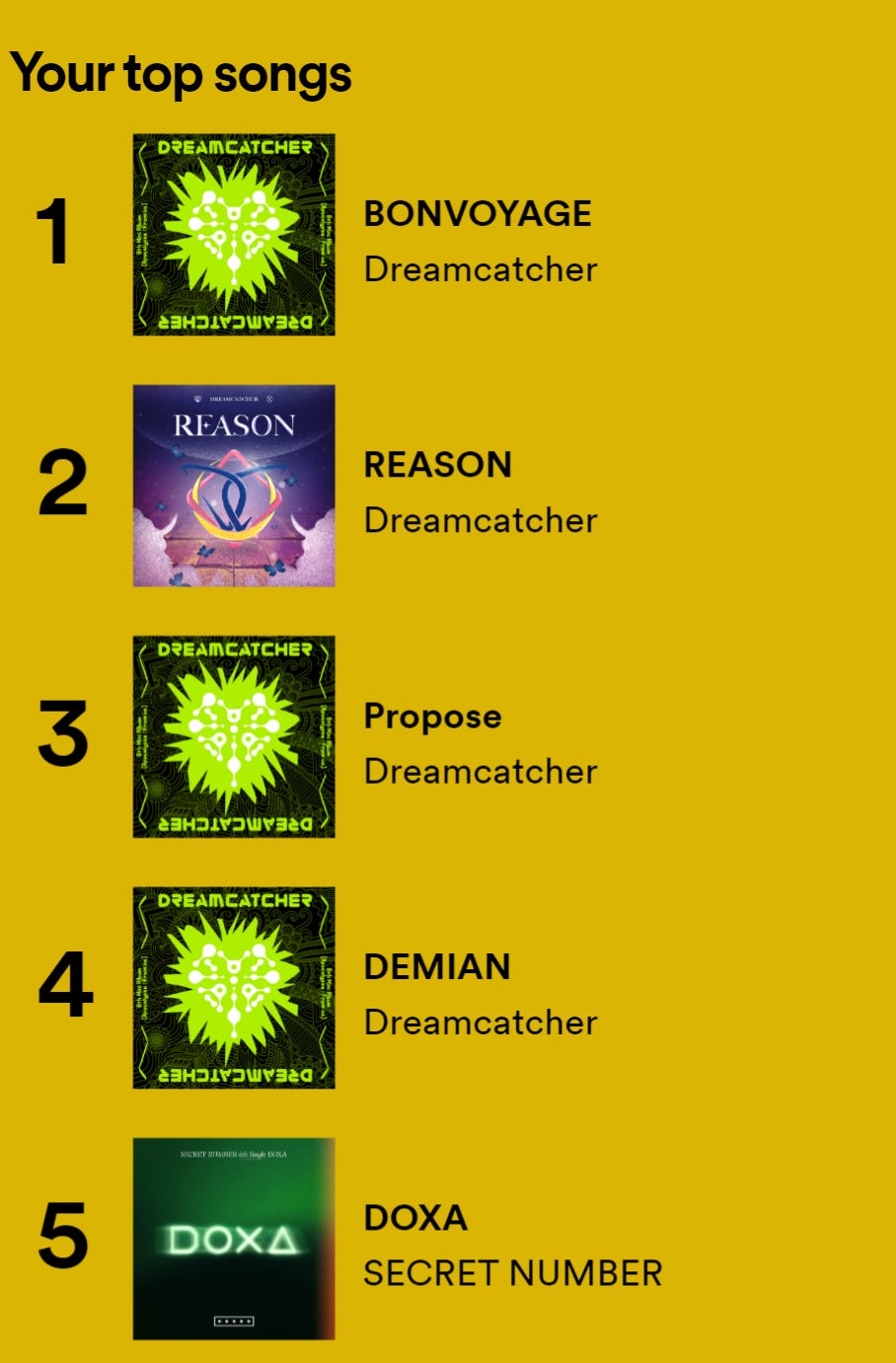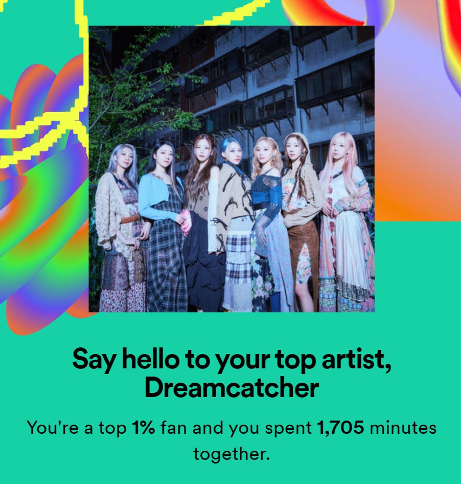 Anyway, with all those potential stressors, I try to find small pockets of fun and joy that I can curl myself up into a ball and fit into, as a way of sheltering, even for just a few minutes, from the insanity of the season. One of those pockets is through Spotify Wrapped, the annual summary of your Spotify listening habits, presented to you in pastel-colored glory through the app or the website. For my part, there aren’t a huge amount of surprises, at least for the top groups or genres I listen to. If you read my articles regularly, it’s no big revelation that my top group is K-Pop rock/pop girl group Dreamcatcher, and that I listen to a ton of that genre plus a few cool JRPG soundtracks. But I still enjoy watching my Wrapped unfold on the screen, showing me just how many minutes I spent and what songs I “accidentally” set on loop and may have sung to badly in the car.