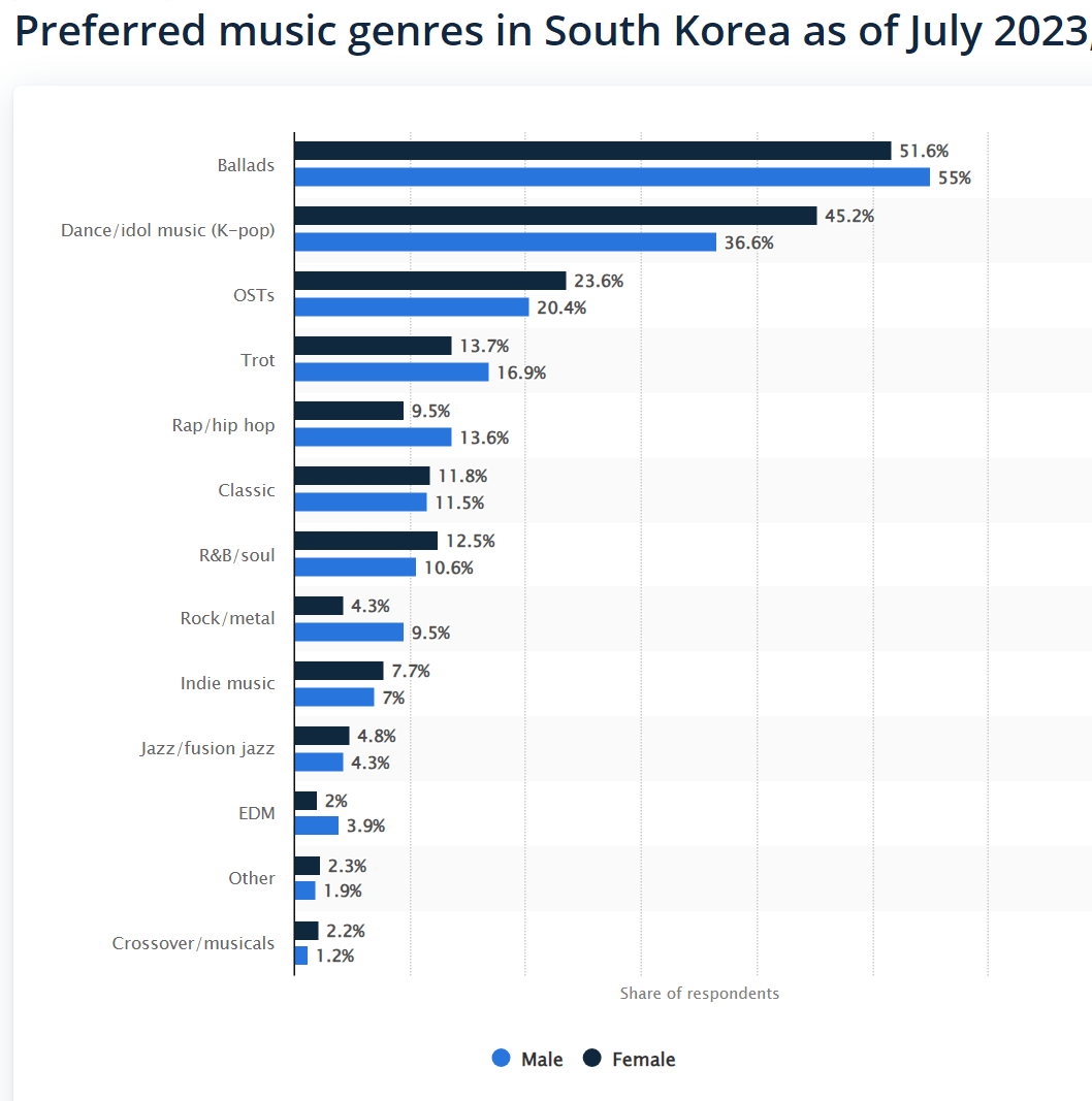 It's important to realize how significant this choice was. According to the above chart by Statista, tracking preferred music genres in South Korea by gender, in mid-2023 Rock didn't even crack 10% on the scale. In general, South Korea's rock scene has seen a history of mostly being underground, with shades of rock/pop acts making it into the public eye only through occasional novelty shows such as MNet's "Great Seoul Invasion" or in events, such as the Jeonju Ultimate Music Festival (an event that, to no surprise, Dreamcatcher has participated in multiple times).