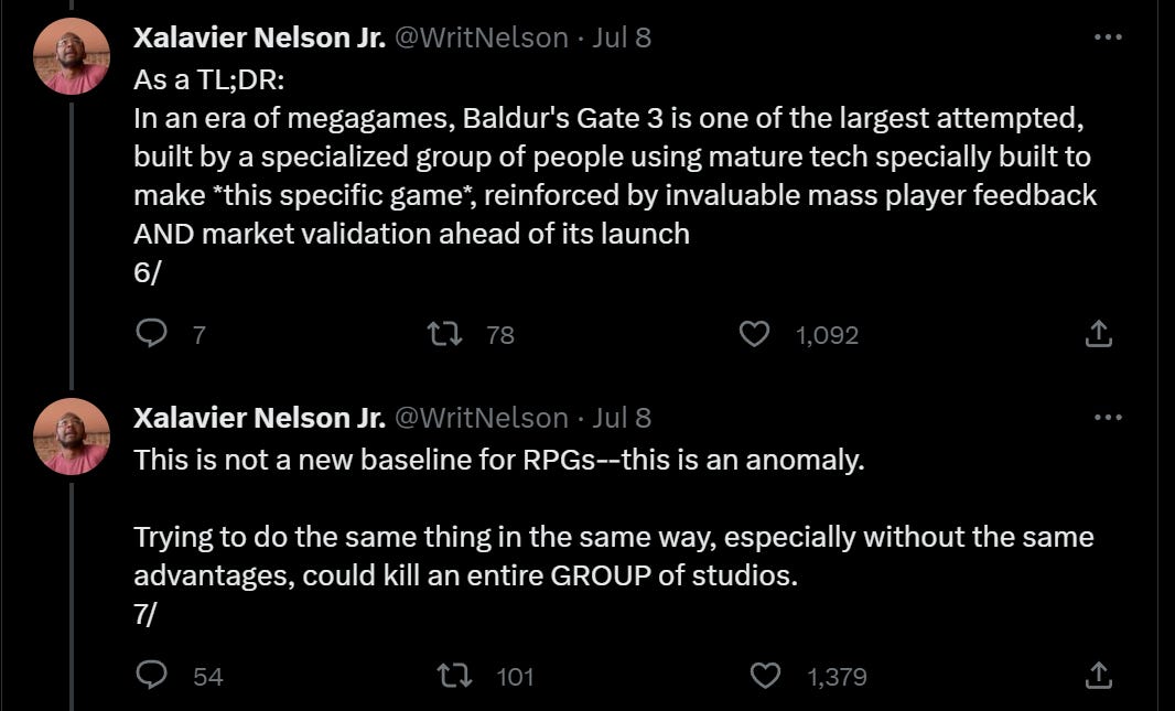 Ultimately, education will likely be the key to avoiding “lost in translation” dialogue in the future. Indie developer Xalavier Nelson Jr., whose Twitter thread on the standard of Baldur’s Gate 3 ironically served as a flashpoint of the conclusions made in the IGN video, has been great not only in full context of the thread in question but engaging in follow-up with his community of followers after that (and that was even before the IGN video was posted). As such, the example Xalavier provides should be one that is duplicated if at all possible. Ensuring that people understand what it means to have a budget behind your game, what it means or is supposed to (or not) guarantee in terms of the outcome of developing that game, and more are all resources that can and should exist for gamers. Places like the free portions of the Game Developer’s Conference vault should be more widely distributed and referred to (and, in my opinion, not be limited just to GDC). Historical videos such as the one-time Extra Credits (now Extra History) feature “So You Want To Be A Producer” should be modernized elsewhere and distributed by credible members of the game development industry. There’s a bunch that can be done, but it probably starts by doing research over being reactionary.